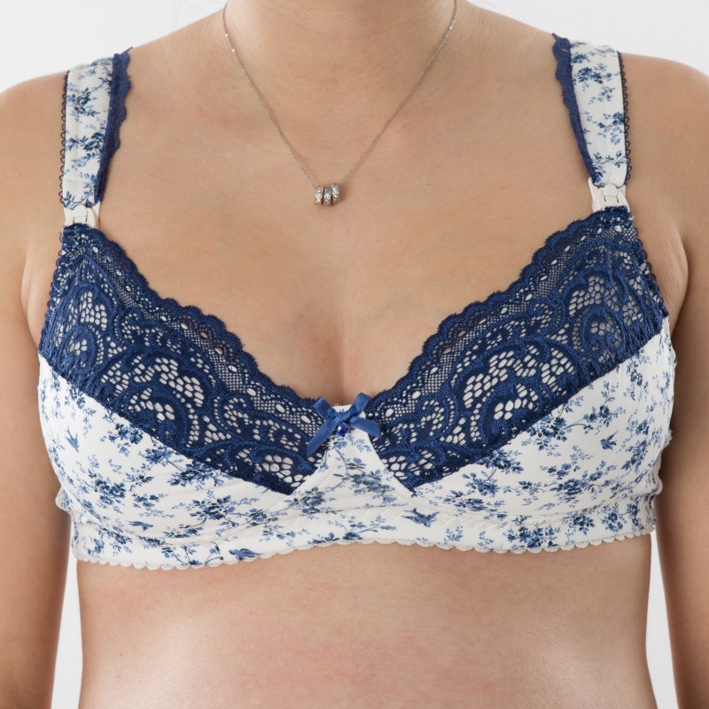 Le soutien-gorge d’allaitement sans armature Camélia séduira les âmes romantiques en leur offrant un modèle aux motifs délicats de fleurs bleues. Cette pièce de lingerie de maternité mettra subtilement en valeur le décolleté de Madame avec sa dentelle française délicate et son petit nœud bleue qui donnera une touche de couleur chaleureuse à ce soutien-gorge.