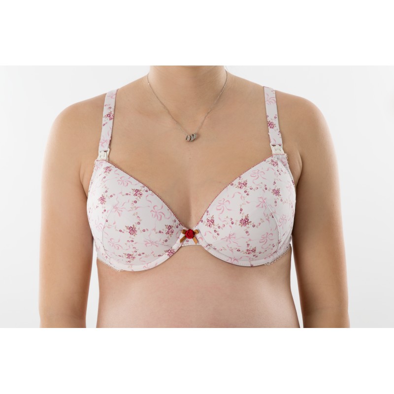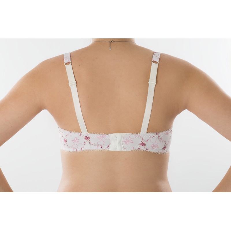 Le soutien-gorge de maternité Paloma avec armatures souples spéciales maternité est réalisé avec du tissu microfibre blanc imprimé floral. La poitrine sera mise en valeur grâce à la coupe décolleté plongeant. Au centre se trouve un petit nœud complété par une rose rouge. Les bonnets sont finement rembourrés pour un meilleur maintien. Le soutien-gorge Paloma est très doux grâce aux coutures plates et doublure en coton à l'intérieur du bonnet. Les bretelles permettent l'allaitement confortable grâce aux clips d'allaitement faciles à ouvrir d'une seule main.