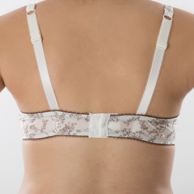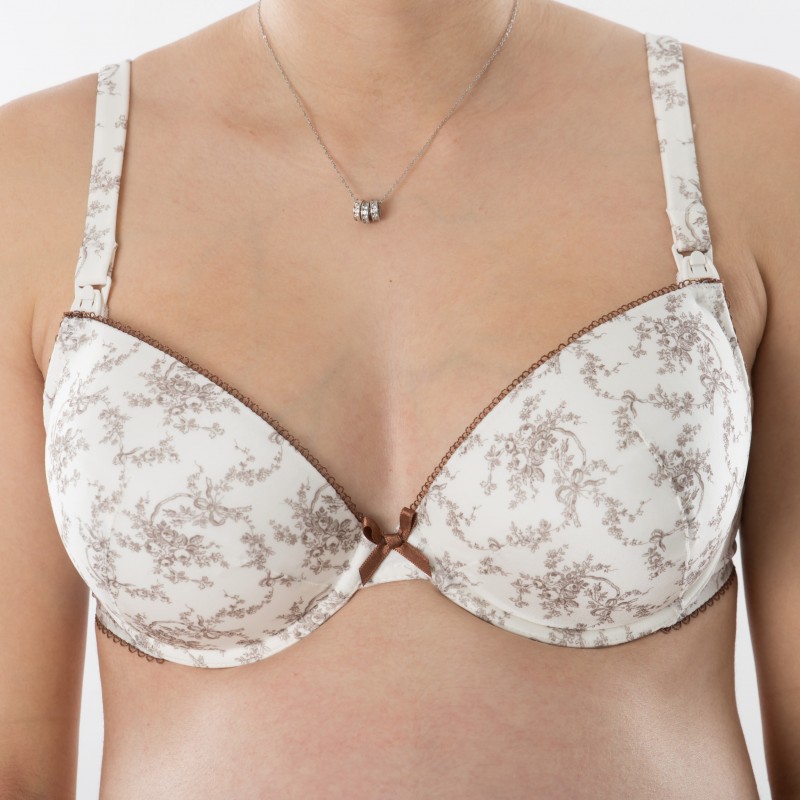 Le soutien-gorge de maternité Bianca avec armatures souples spéciales maternité est réalisé avec du tissu microfibre blanc imprimé floral marron. La poitrine sera mise en valeur grâce à la coupe décolleté plongeant. Au centre se trouve un petit nœud marron. Les bonnets sont finement rembourrés pour un meilleur maintien. Le soutien-gorge Bianca est très doux grâce aux coutures plates et doublure en coton à l'intérieur du bonnet. Les bretelles permettent l'allaitement confortable grâce aux clips d'allaitement faciles à ouvrir d'une seule main.