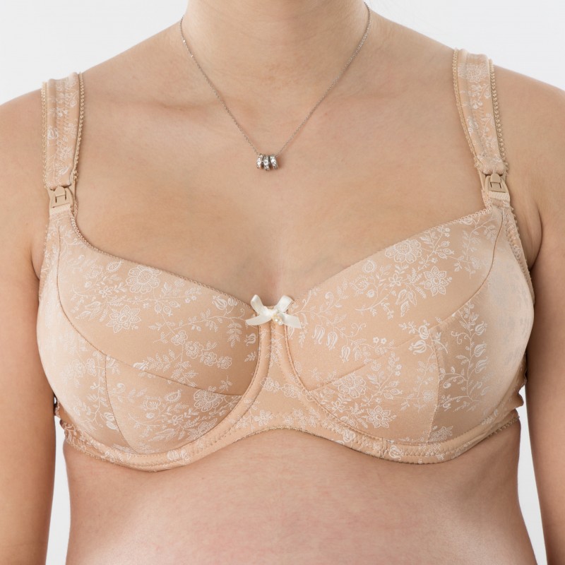 Le soutien-gorge de maternité Versailles avec armatures souples spéciales maternité est réalisé avec du tissu microfibre stretch beige en imprimé floral blanc. Les bonnets sont finement rembourrés pour un meilleur maintien. Le soutien-gorge est très confortable grâce aux coutures plates à l'intérieur du bonnet. Parfaitement adapté pour une forte poitrine, ce modèle est doté des bretelles larges, réglables et légèrement rembourrées pour soulager les épaules. Les bretelles permettent l'allaitement confortable grâce aux clips d'allaitement faciles à ouvrir d'une seule main.